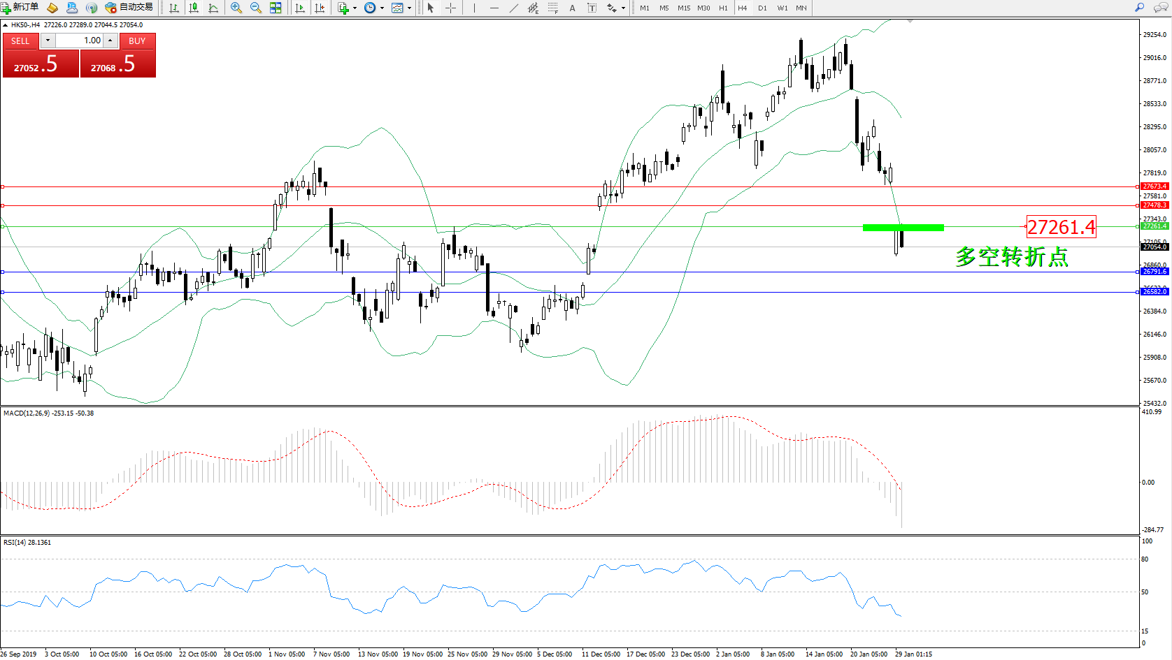 香港恒生指数1月29日(周三)收盘下跌789.01点,跌幅2.82%,报27160.63点;截至今日收盘,恒指大市成交额为1240.51亿港元(上一交易日成交额为473.22亿港元),港股开年首日大跌,受肺炎疫情影响,港股开年首日大跌。此次肺炎疫情冲击着各大行业,旅游、影视、博彩等皆受其影响。今日皆反应在股票市场上,市场全日低迷,盘中虽略有回升,但始终保持大跌。从板块表现看,系统软件、阿里概念逆势领涨,医疗保健、生物科技走强,香港零售股跌幅最大,影视娱乐、奢侈品、濠赌股、纷纷大跌。个股方面,腾讯盘中一度升逾1%,收跌0.67%;恒隆地产大跌6.67%领跌恒指;医药股普遍强势,山东新华制药逆市飙升近28%,阿里健康大涨超9%,平安好医生、白云山皆走强;生物科技股金斯瑞生物生超4%;在线教育股新东方在线升超7%。