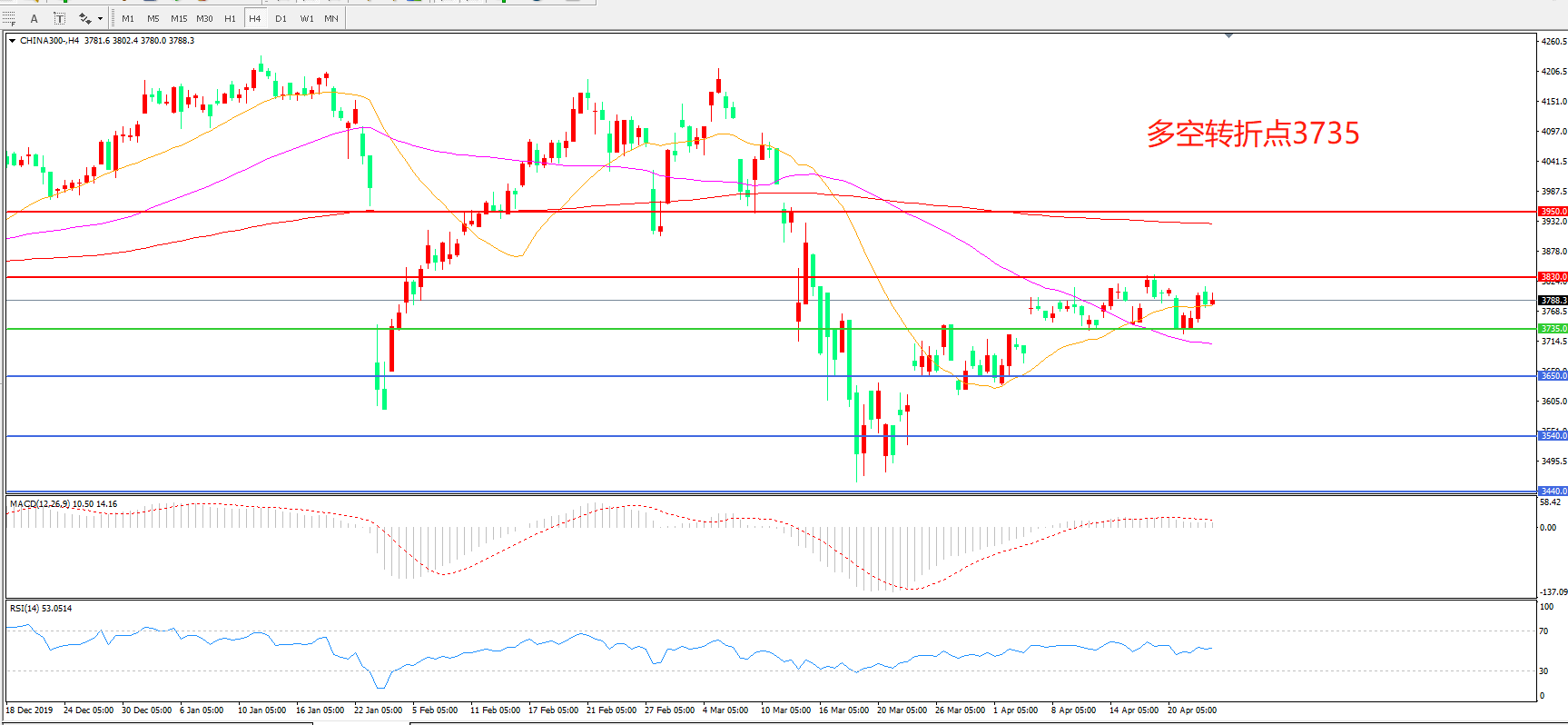 4小时图看,沪深300延续区间震荡, 3735成为短期支撑,3830成为上方支撑,均线系统走平,MACD红柱增加,RSI指标走平,日内延续震荡概率较大。