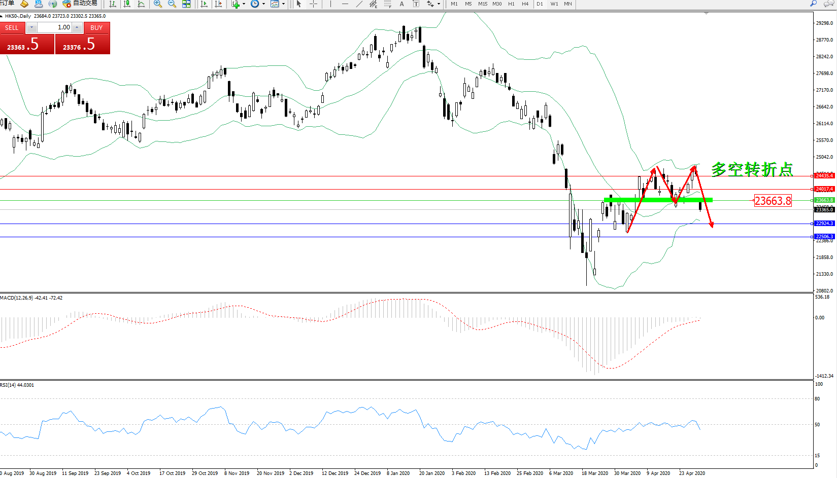香港恒生指数54日(周一)收盘下跌1029.79点,跌幅4.18%,报23613.80点;全天维持低位震荡态势,最终收盘重挫逾千点,港股三大指数均大跌超4%,首季“三桶油”大幅亏损,中石化、中石油股价均大跌近9%;三大航空股皆重挫,南航跌超6%;恒指成份股无一飘红,腾讯、友邦保险、工商银行皆大跌超4%。因美国总统特朗普威胁将就冠状病毒疫情采取报复行动,市场风险情绪恶化,且大型企业的盈利预警导致股市大跌。鉴于疫情的影响范围之大,随着封锁措施解除,地缘政治紧张局势升级的风险肯定很高;这显然将是全球贸易受到的又一次打击。