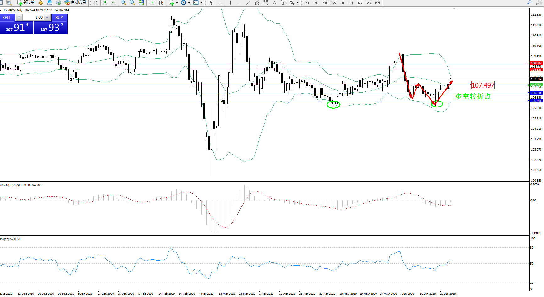美元兑日圆低位连续数日强势反转拉升至107.964位置徘徊,日内美元指数表现强势,日元近期失去避险属性,根据周二发布的声明,与6月相比,日本央行扩大了7月计划下10年及以下期限债券的指示性购买范围,购买频率保持不变。日元避险需求近期被打压,投资者避险更青睐美元,而日本本身近期的经济数据并不佳,日本5月工业生产连续第四个月下滑,日元资产吸引力有限。