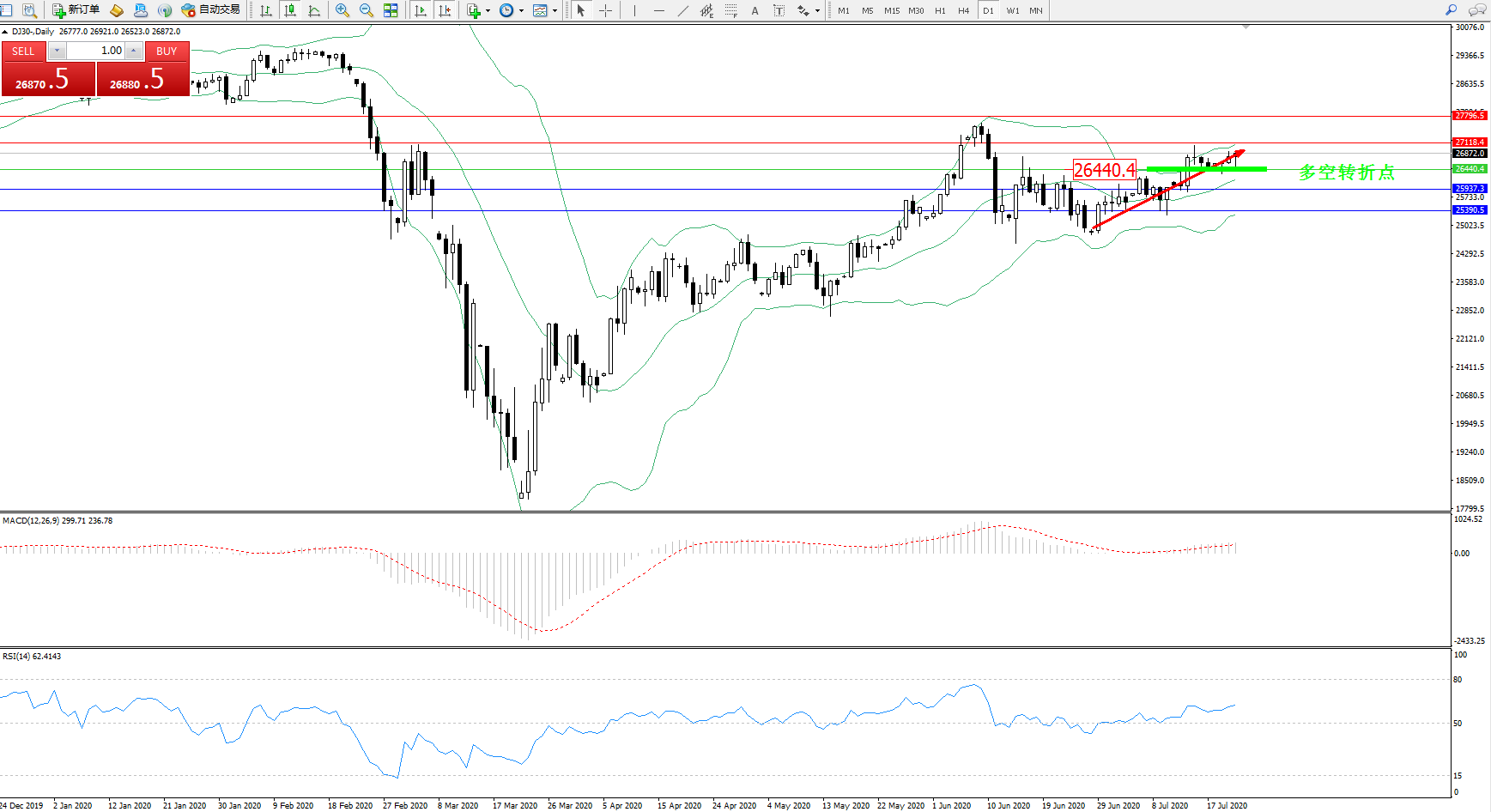 道琼斯指数7月22日(周三)收盘上涨165.40点,涨幅0.62%,报27005.84点。美国新纾困法案目前陷入僵局,共和党内部对新的抗疫纾困法案依然有争议。法案的细节周二依然在不断变化。在共和党制定的抗疫纾困新法案草案中,基本上支持对个人发放新一轮现金以刺激经济,延长补充性失业救济,加大检测拨款,但对美国总统特朗普想要的下调工资税提出疑问;特朗普将工资税减免视为谈判中的红线问题。其此前已向国会山共和党人表示,除非将削减工资税的条款囊括在内,否则他不会签署新的病毒援助法案。美国财政部长姆努钦和白宫幕僚长梅多斯此前声称,希望在下周末前在国会通过刺激法案。但由于共和党内部对于工资税的争议,他们已经撤回预期;在时间方面,众议院将从7月31日起开始休会一直到9月,参议院则会在8月7日开始休会。这意味着众议院7月31日前就必须通过议案,且必须是最终版本。而第一轮刺激刺激措施到期日为7月底。考虑到两党分歧,工资税问题使得谈判更加紧迫,更加困难。