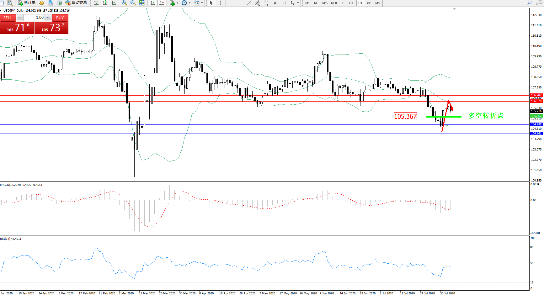 技术点评:高位空头动力延续布林带指标下轨持续弱势下行数日后,低位抵达104.161附近出现快速回升至布林带指标中轨附近整理,触及中轨后开始再度弱势下移,布林带指标呈张口走势后以后收口迹象且下行趋势有形成态势,MACD指标处于0轴线下方空头区域弱势整理震荡下移后开始平移,RSI指标处于空头动力持续震荡下移后出现快速拉升走势;