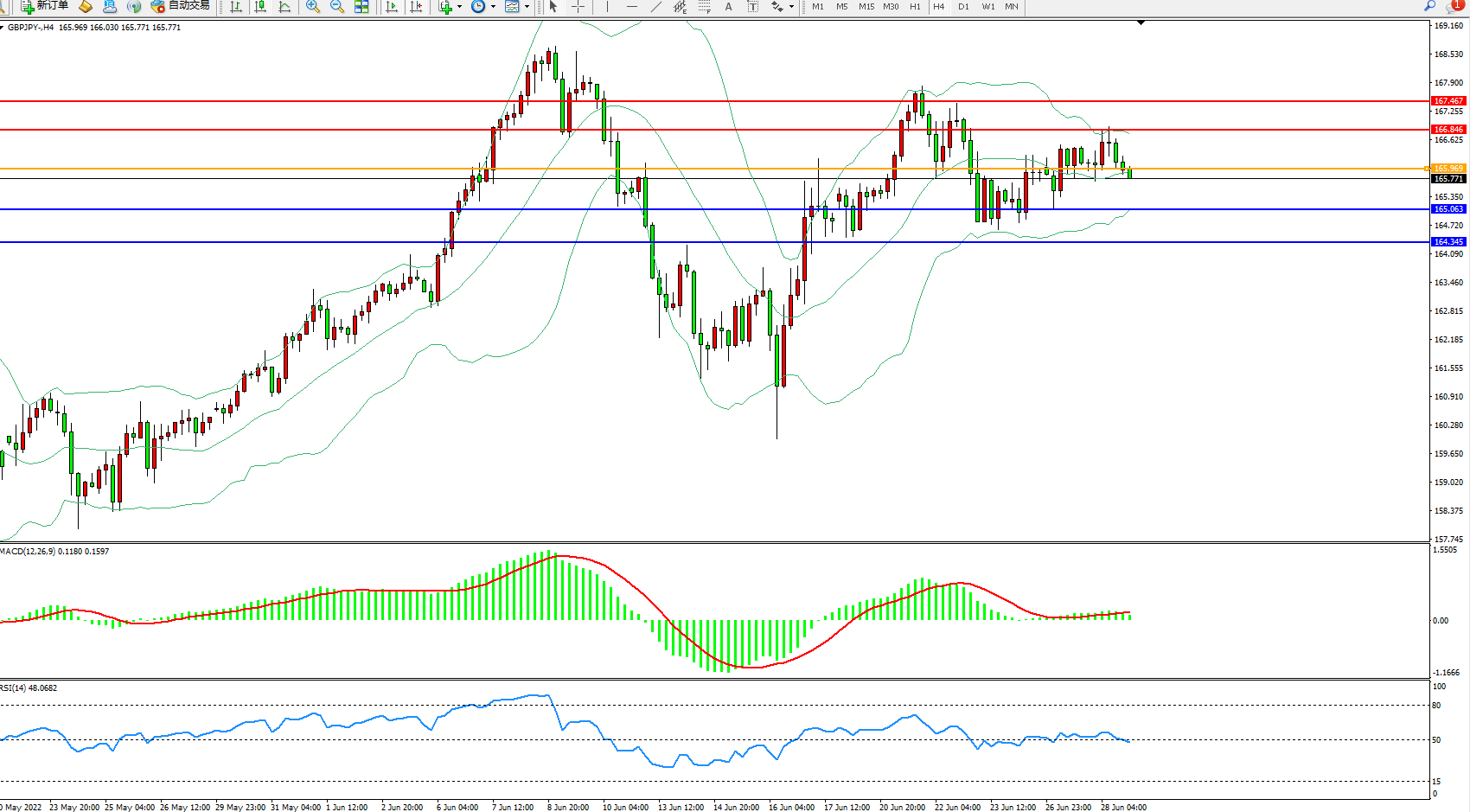 4小时图看:长时间维持在布林带指标通道内窄幅弱势整理,缓慢上移至中上轨区间震荡后开始回撤,布林带指标呈收口走势持续中,MACD指标处于0轴线附近徘徊,RSI指标处于50均衡线附近窄幅整理中;