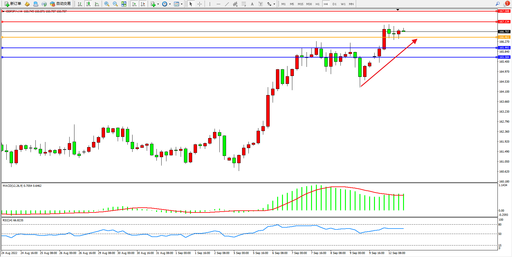 4小时图看:多头动力维持震荡上扬,高位开始窄幅整理,市场多头动力有继续拉升态势,MACD指标处于多头区域维持整理,RSI指标处于多头区域维持徘徊;