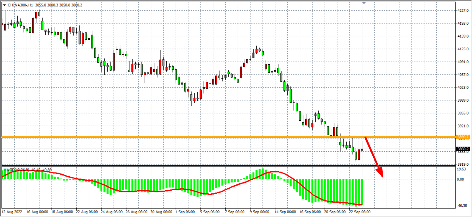 1小时图看,沪深300反弹至3890后再度出现回落,该位为前期低点,随着该支撑被下破后当前已转化为阻力,同时MACD在零轴之下持续量能放大尚无缩量迹象,显示趋势延续空头下跌为主。