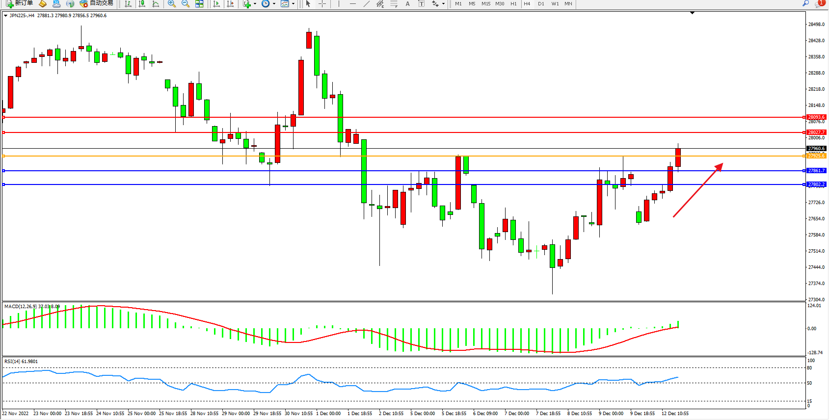 4小时图看:多头动力强势拉升,短期看涨情绪涌现,MACD指标处于0轴线上側徘徊,RSI指标处于50均衡线上側弱势整理;