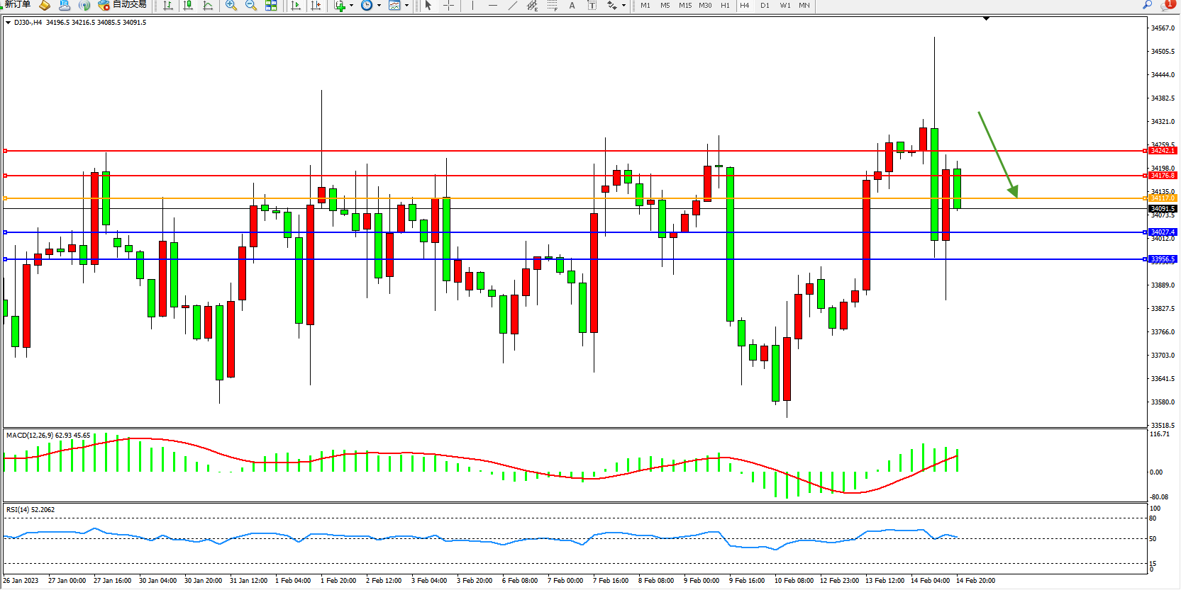 道琼斯指数2月14日(周二)收盘下跌156.14点,跌幅0.46%,报34089.79点;美国1月未季调CPI年率录得6.4%,为连续第7个月下降,创2021年10月以来最小增幅。联邦基金利率期货目前预计7月前联邦基金利率最高将达到5% -5.25%,而早些时候联邦基金利率上升的几率接近均等。