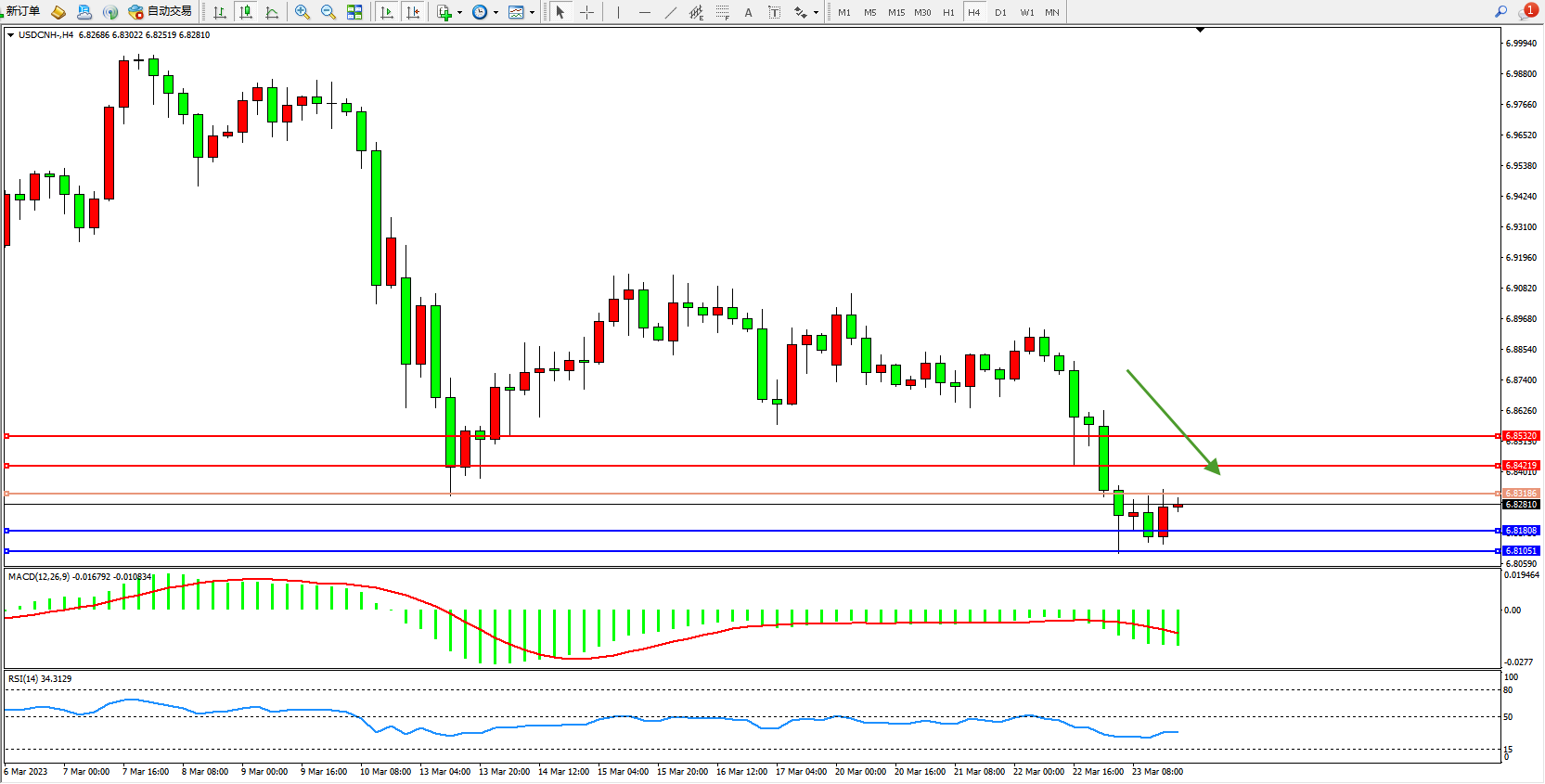 美元人民币USDCNH——4小时K线图显示: