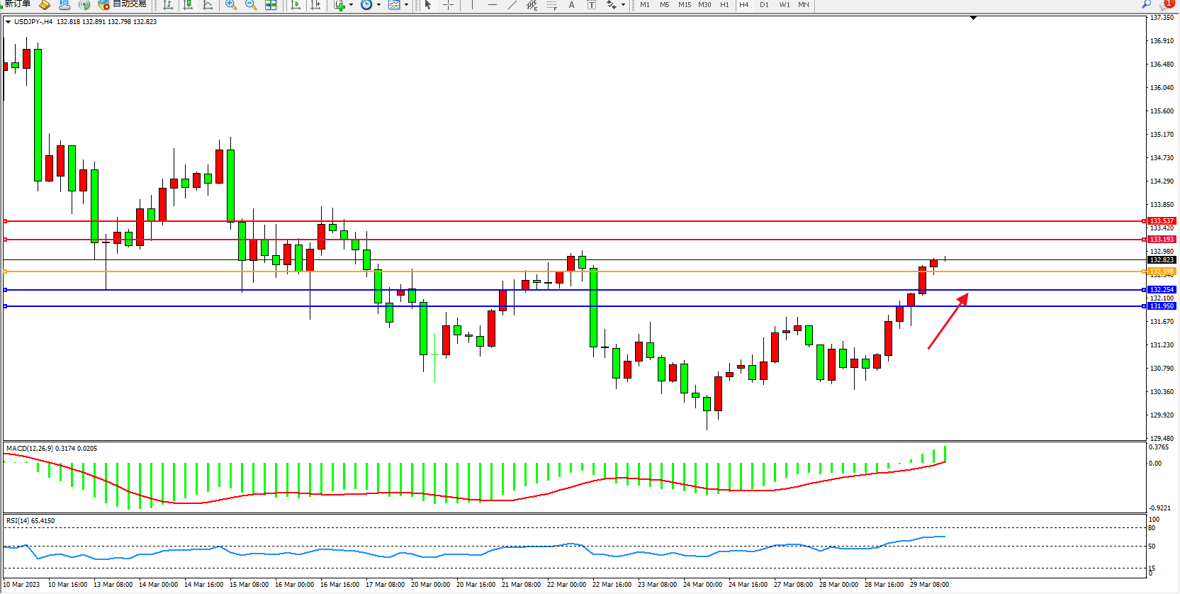 4小时图看:多头动力维持震荡上扬,短期看涨情绪涌现,市场多头不断向上拉升中,MACD指标处于多头区域缓慢上行,RSI指标处于多头区域维持徘徊;