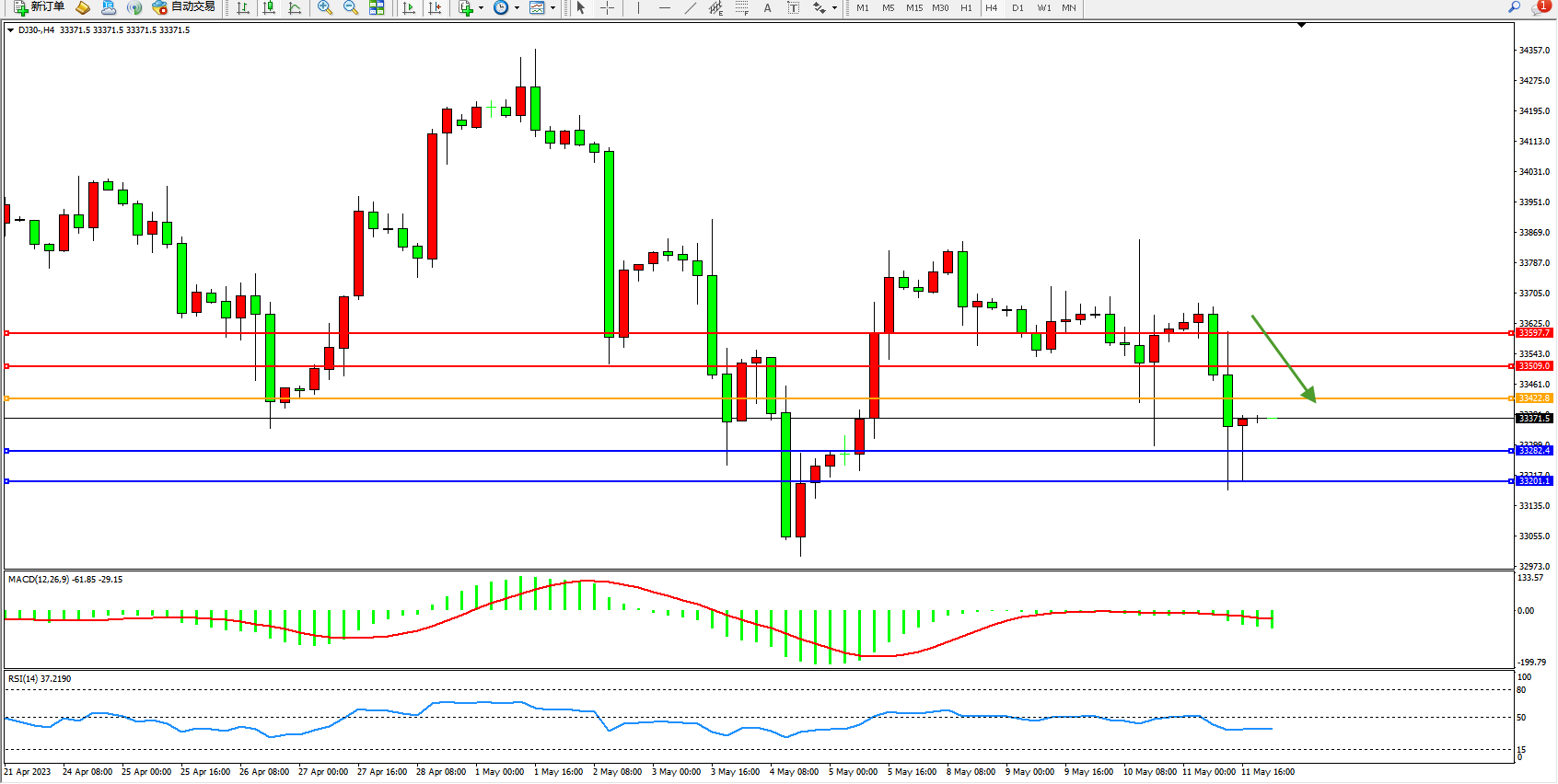 道琼斯指数5月11日(周四)收盘下跌221.29点,跌幅0.66%,报33310.04点;美国上周初请失业金人数上升至2021年以来的最高水平,这表明劳动力市场正在降温。最近的数据高于2019年(疫情爆发前)约22万人的周平均水平。申请失业救济人数今年呈上升趋势,表明失业人数正在从历史低点上升。