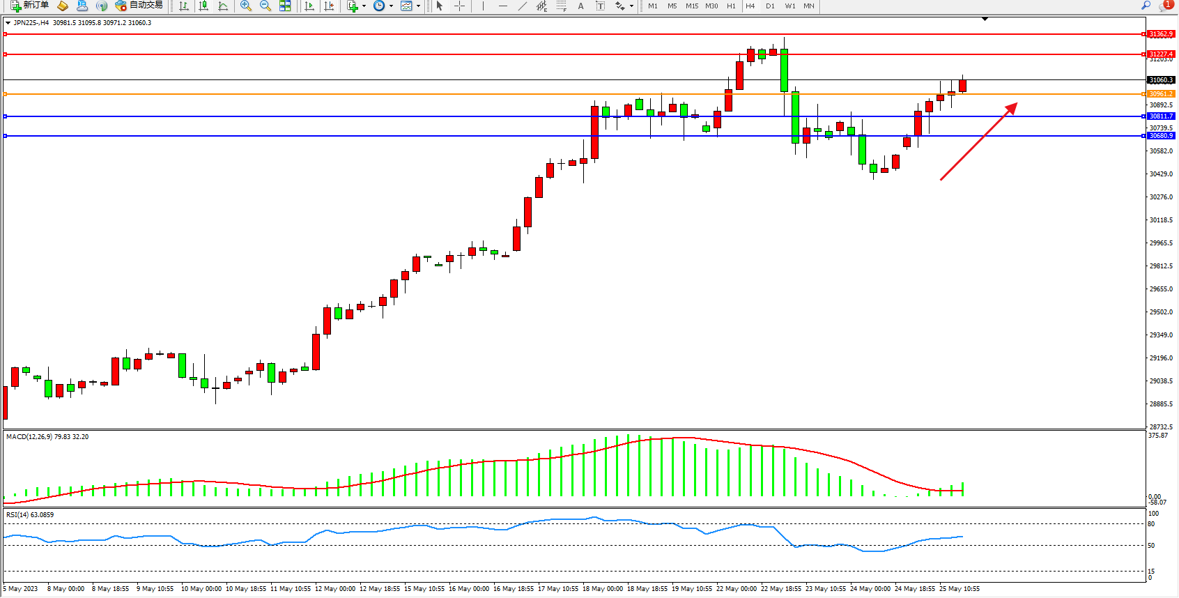 日经225指数5月25日(周四)收盘上涨95.00点,涨幅0.31%,报30788.50点。日本央行行长植田和男:我们最重要的任务是稳定、可持续地实现2%的通胀目标。开始看到经济中出现了一些好迹象,但距离稳定、可持续地达到通胀目标还有一段距离。日本央行将耐心维持宽松的货币政策。