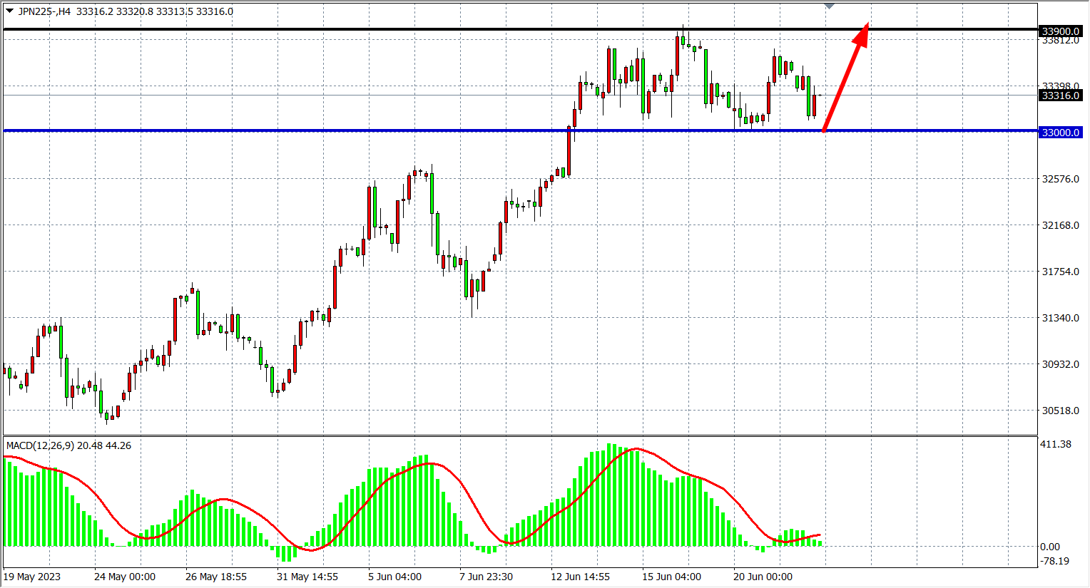 4小时图看,日经指数在33000-33900间继续走宽幅盘整,MACD量能在零轴附近震荡,行情维持高位盘整,阻力关注33900,支撑关注33000。