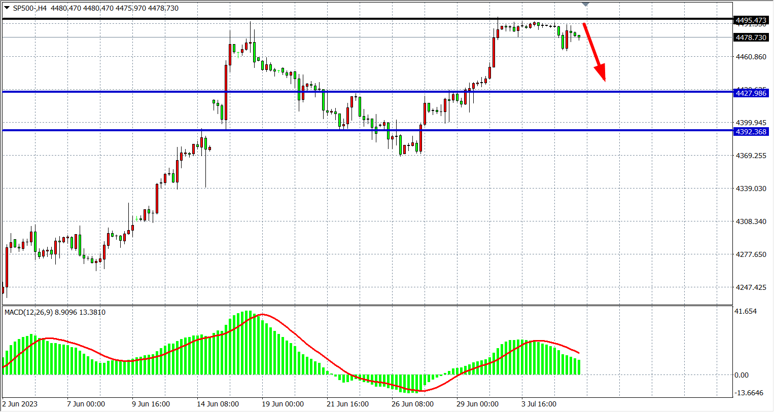 4小时图看,标普维持在前高点4495一线盘整,MACD量能零轴上缩量,后市主要关注4495得失,破位打开新一轮上行行情,连续受阻则看回调。