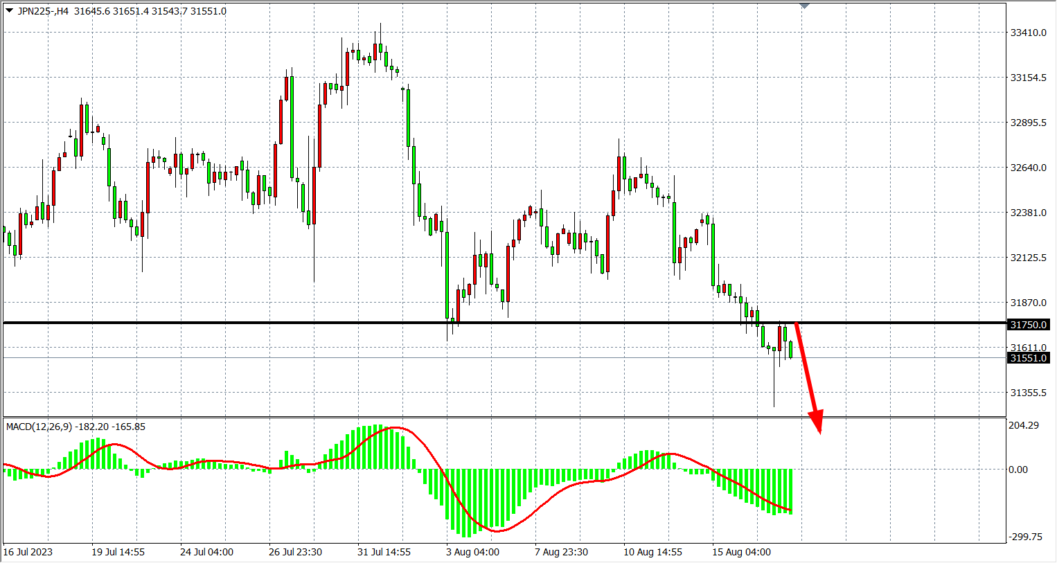 4小时图看,日经指数再度走低跌破31750,MACD量能在零轴下,空头趋势延续,阻力关注31750-32000。