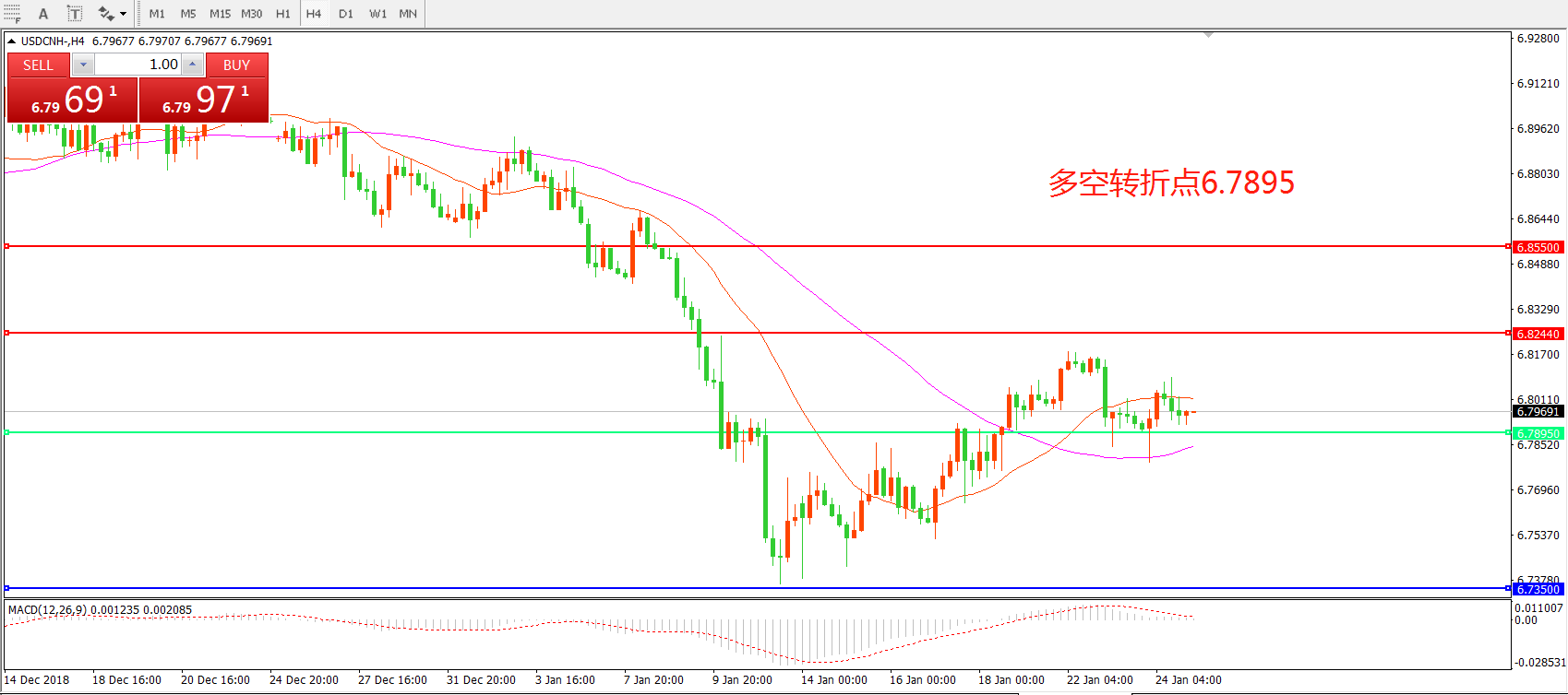 4小时图均线金叉上攻,MACD在0轴上方运行,动能柱放量,企稳6.80重要关口,预计汇价将进一步走高。