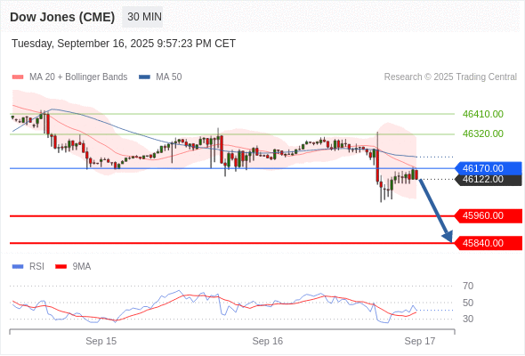美国道琼斯指数期货 (Z5) 当日内: 短期关键阻力位在46170.00。