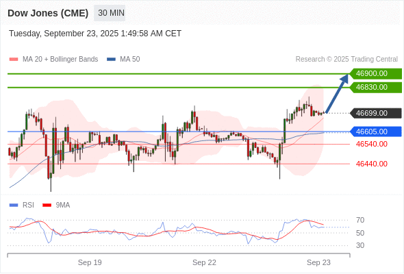 在 46605.00 之上,看涨,目标价位为 46830.00 ,然后为 46900.00 。