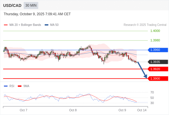 美元/加元 当日内: 朝1.3900运行。