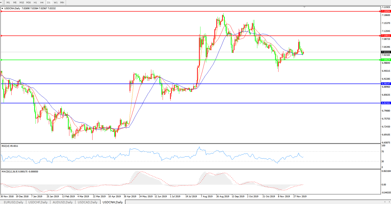 技术面简析:日图均线粘合无明显方向,汇价7.0关口上方开始逐步回落,MACD自0轴下方逼近0轴且量能收缩几无,RSI有走高迹象,预计短期汇价将在7.0关口附近整理,中期汇价需等待美元指数及中美贸易谈判最新进展指引。