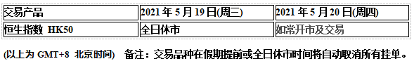 因应2021519(周三) 为香港佛诞假期,HK50恒生指数的交易时间将于假期期间休市,敬请知悉留意!